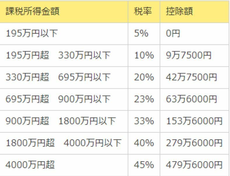 Thuế thu nhập (所得税) = Tổng số tiền bị đánh thuế (課税所得) × Thuế suất (税率) − Giảm trừ thuế (控除額) = (2,987,000 × 10%) − 97,500 = 201,200